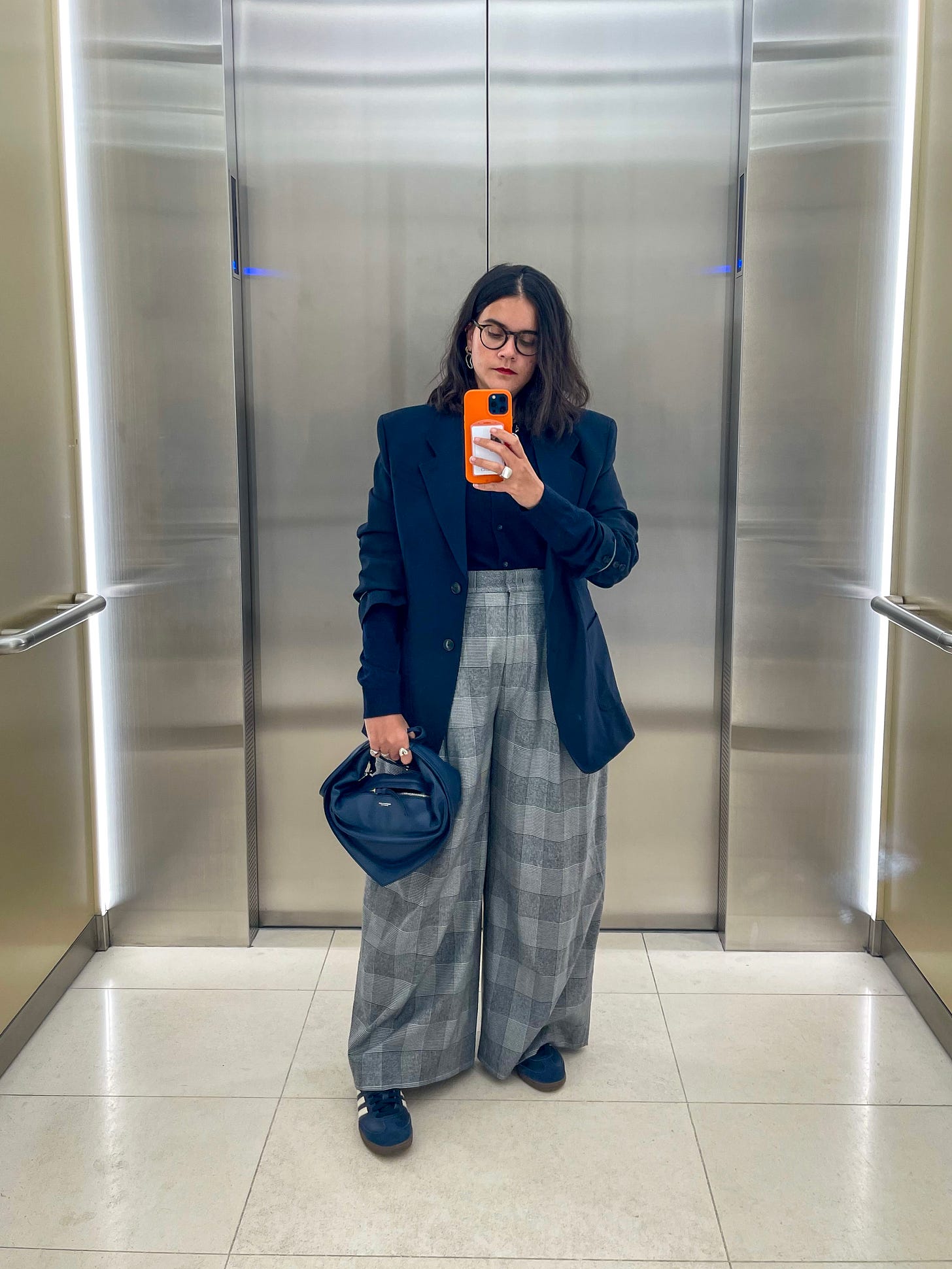 Eu estava querendo usar essa pantalona com estampa de Príncipe de Gales há um tempo, então, coloquei ela na folha em branco e fui catar algo que entrasse bem. A primeira coisa. Não estava com tempo para polir essas escolhas! Aí, pensei em usar azul marinho no resto.