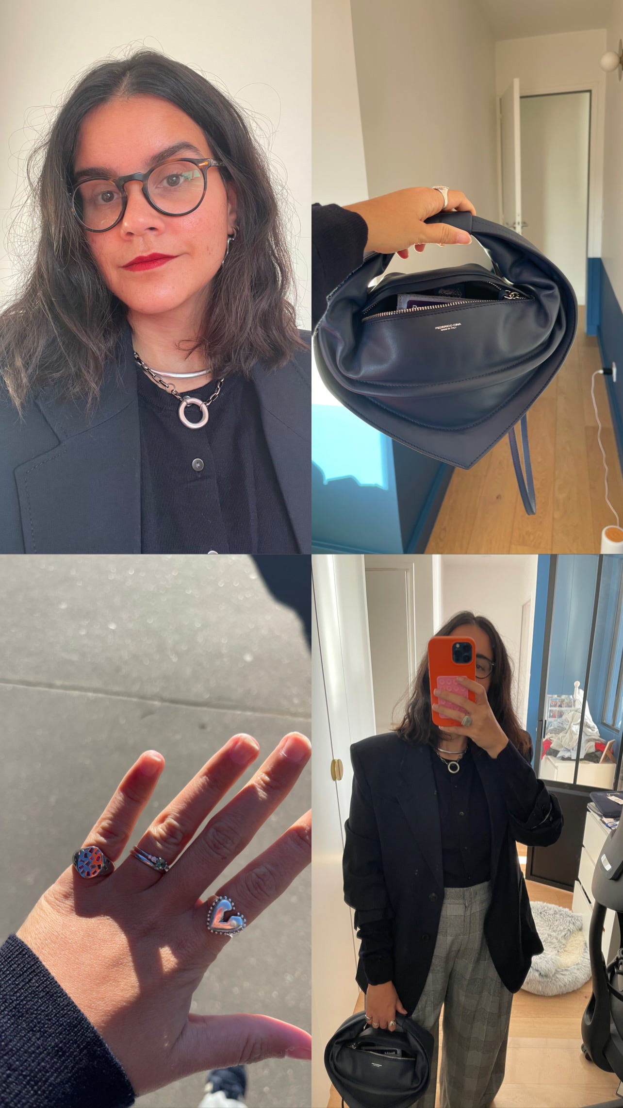 De primeira, achei que ia ser muito corporativo e eu tenho alergia a isso. Daí, me lembrei que agora eu sou uma usuária recreativa de azul marinho e já fiquei na moral. O brilho fica nas modelagens: (i) o blazer é over; (ii) ao invés de usar uma blusa tradicional, coloquei um suéter fininho fechado, o que eu sempre acho que dá um charminho; e (iii) a bolsa se chama tortellini, bom, por parecer um tortellini (isso, a massa). Bom, coloquei um batom vermelho (azul marinho pede!) e fiz um mix de anéis e colares. Aí, cê vê, são esses os detalhes em que eu me apeguei para curtir a montação que eu usei e passar o dia satisfeitinha com ele.